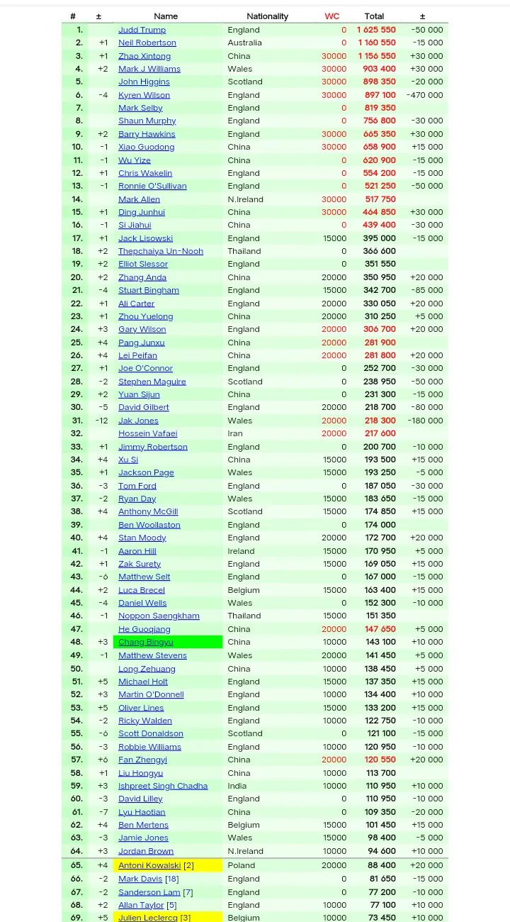 大比分3-7落后之下打出一波七连鞭大逆转的凯伦·威尔逊,由于扣除了上上赛季世锦赛冠军奖金积分,排名下降四位来到第6,第二轮对阵艾伦,后者也是大逆转晋级,在大比分4-6落后之下打出一波六连鞭淘汰了排名赛一冠三亚得主张安达,张安达连过两轮资格赛晋级正赛,排名上升两位来到第20。
