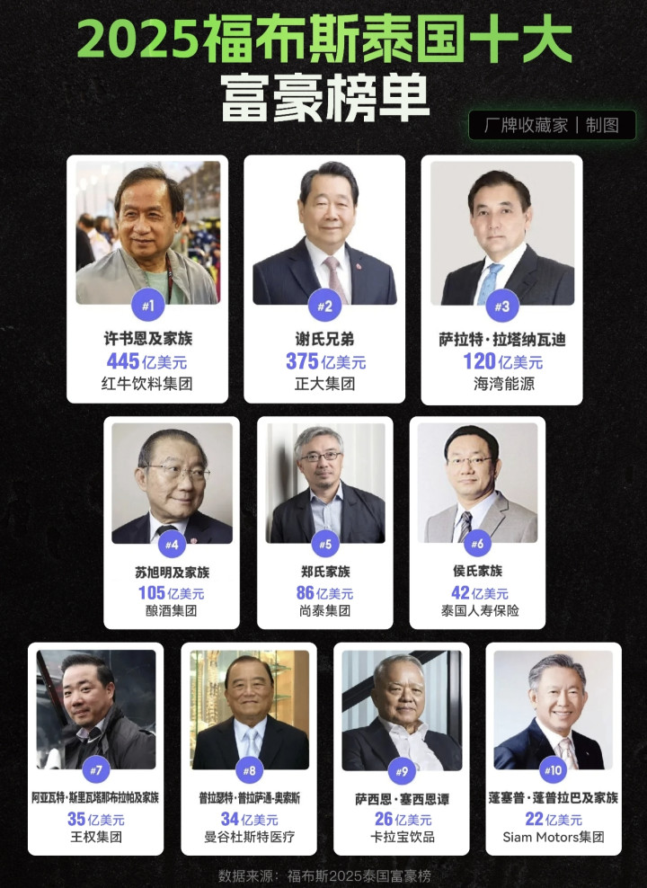 总体来说泰国富豪以华裔为主,这些人当年下南洋奋斗的不错。他信家族虽然已经挤出前十了,但还是很有实力的,以后主要看儿女的表现了。